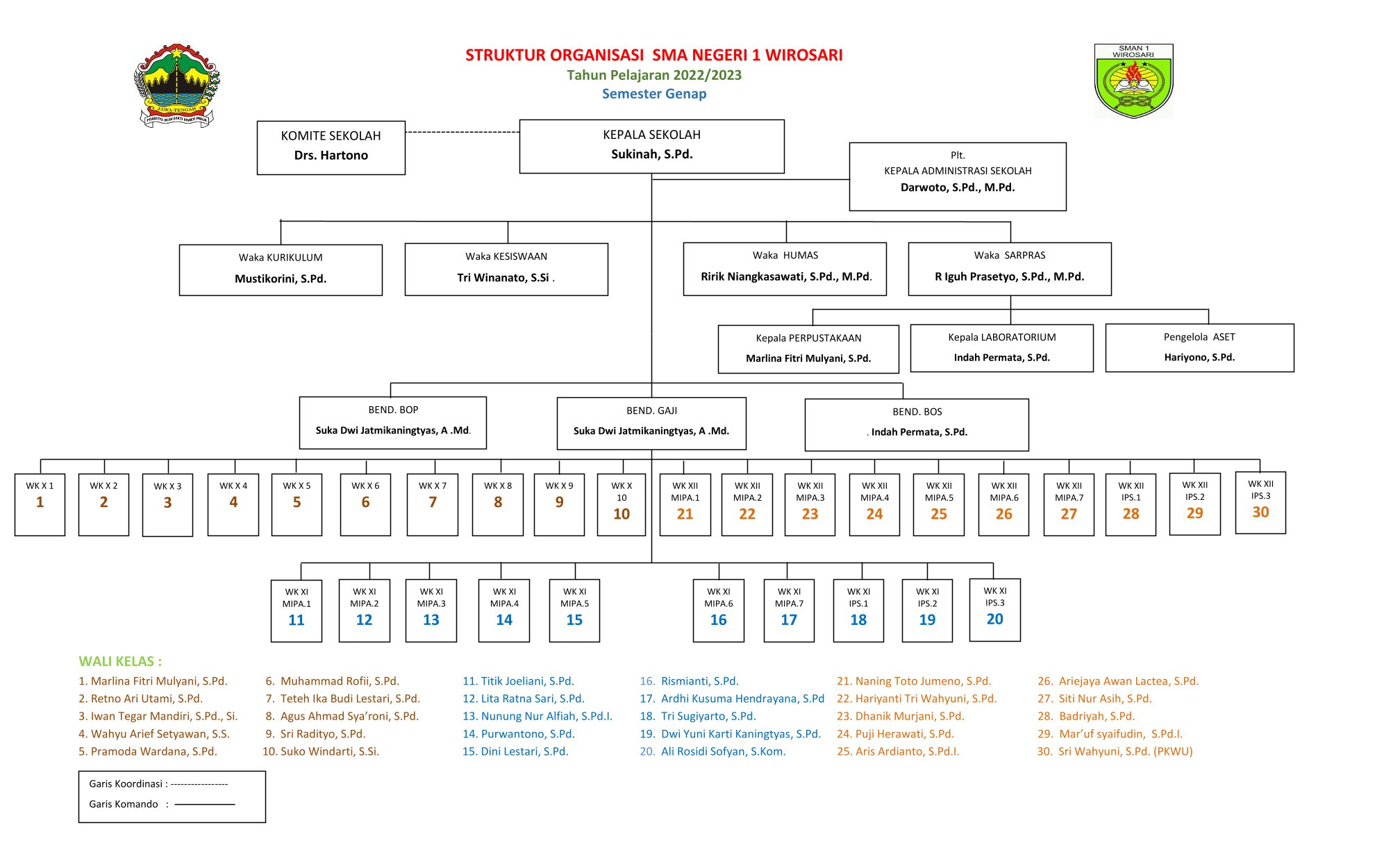 Pengelolaan dan penyelenggaraan pendidikan saat itu masih diampu oleh guru-guru dan tenaga pendidikan SMA Negeri 1 Kradenan dibawah pimpinan kepala sekolah bapak Drs. J. Sarsono. Baru pada Bulan Juli 1990 SMA Negeri 1 Wirosari memiliki kepala sekolah definitive yang pertama yakni bapak Drs. H. Soedirdji. Beliau memimpin SMA ini hingga bulan Desember 1996. Kemudian dilanjutkan kepemimpinan ibu Hj. Sutarti, S.Pd. dari bulan Desember 1996 hingga 30 November 2002. Selanjutnya Bapak Drs. Kardiyono sebagai Plt menjabat Kepala sekolah dari Desember 2002 hingga Mei 2003. Diteruskan kepemimpinan Bapak Drs. Hadi Purnomo dari bulan Mei 2003 hingga bulan Juni 2005. Kemudian dilanjutkan oleh Bapak H. Muhono, S.Pd. MM sebagai kepala sekolah ke 5 yang memimpin dari bulan Juni 2005 hingga Maret 2009. Dilanjutkan oleh kepala sekolah keenam yakni Bapak Gunawan , S.H., hingga bulan Oktober 2010. Dilanjutkan kepemimpinan Bapak H. Partono , M.Pd. dari bulan November 2010 hingga Januari 2012. Setelah itu dilanjutkan oleh kepala sekolah kedelapan yakni Bapak Amin Hidayat, S.Pd.,MM dari bulan Januari 2012 hingga bulan Juni 2014. Mulai tahun pelajaran 2014/2015 dilanjutkan kepala sekolah yang kesembilan yakni Sarwaedi, S.Pd., M.Si.